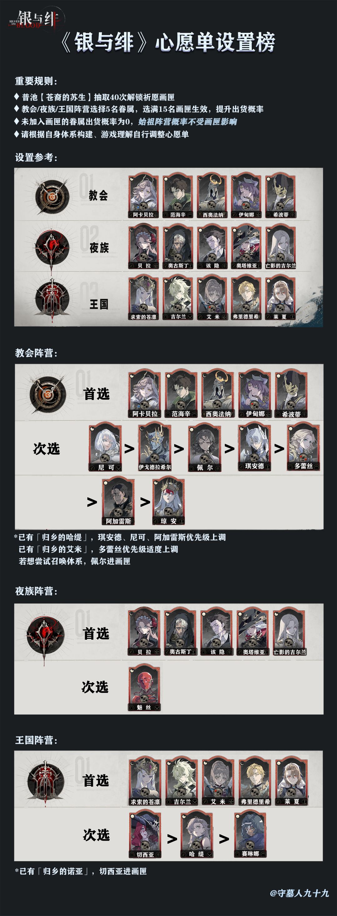 规则: ·常驻池宣告40次后,开启祈愿画匣功能; ·基于阵营教会/夜族/王国,每个阵营选择5名眷属,出货概率更高,未加入匣中的眷属出货概率为0%; ·祈愿画匣选中15名眷属才生效,匣内眷属可随时更换; ·画匣不包含限定角色,不包含肝取波奇娜,也不包含始祖阵营,即归乡的诺亚、归乡的哈缇、归乡的艾米、莉米姆、浴火的阿加雷斯、赛特6位角色无法自选也无法ban掉,维持原有概率。 常驻池[苍裔的苏生]祈愿画