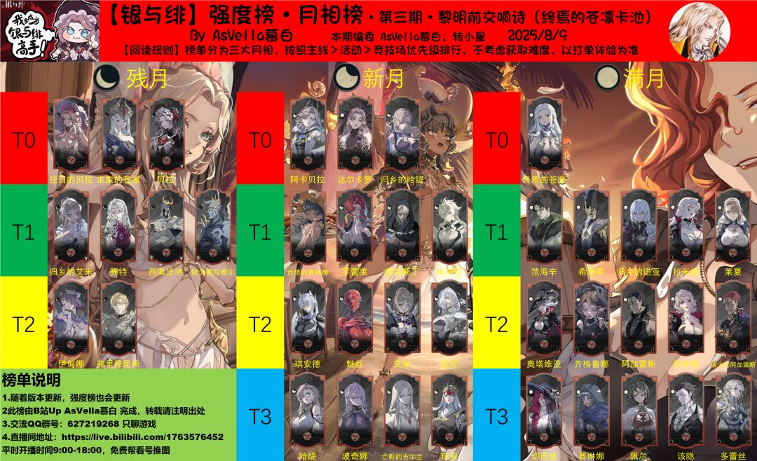银与绯我们需要注意: 第一就是角色配队是传统意义上的奶T输出,根据不同副本改变定位人数; 第二是月相机制,通过分别使用新月、残月、满月的技能后,会进入持续10秒的血月状态,期间所有角色提升25%增伤,花费点数全部减一,作为输出的关键buff,所以配队还需要根据三种月相花费的点数合理分配; ✅️阵容详细讲解:游戏角色分为4个阵营,6种职业;分别为始祖阵营、教会阵营、夜族阵营、王国阵营;历战者(有输出
