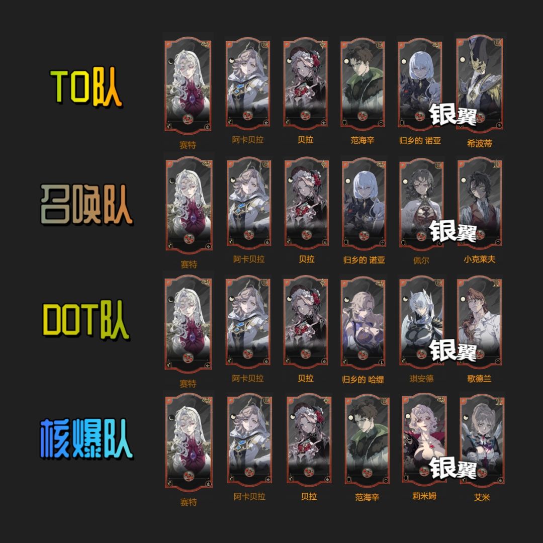 🌟 召唤流 核心:切西亚 配队:贝拉 + 切西亚 + 拉米亚 + 赛特 +归乡的诺亚 其他适配角色:佩尔、哈缇、艾米 🔥灼伤流 核心:归乡的哈缇 配队:尼可 + 归乡的哈缇 + 琪安德 + 阿加雷斯 + 赛特 其他适配角色:洁丝 💥暴击流 核心:莱夏 配队:莱夏 + 拉米娅 + 安普莎 + 范海辛 + 阿卡贝拉 其他适配角色:希波蒂、赛特 #今天游戏圈发生了啥 #银与绯