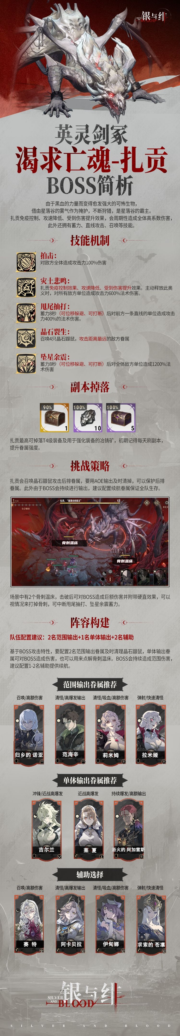 渴求亡魂-扎贡是英灵剑冢第一个关卡BOSS,最高可掉落T4级装备及用于强化装备的冶铸矿,今天给大家带来BOSS的挑战策略及相关英雄推荐,小伙伴们可以做个参考。 以上就是本期内容的全部内容啦,如果有任何疑问可以在评论区提出,会给大家及时解答。如果有帮助,可以点个收藏、关注,我们下期内容再见。 #银与绯 #银与绯626公测 #银与绯公测 #银与绯剧情 #攻略