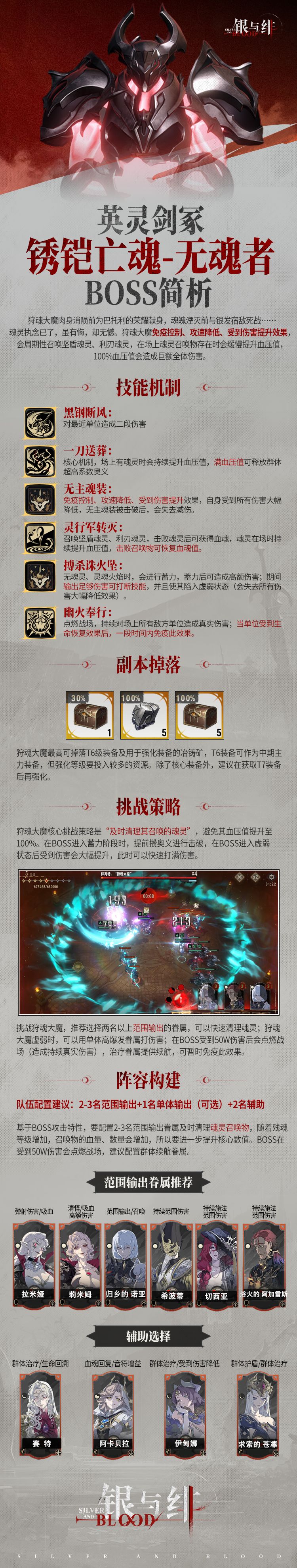 锈铠亡魂-狩魂大魔是英灵剑冢第二个BOSS,最高可掉落T6装备及用于强化装备的冶铸矿,今天给大家带来BOSS挑战策略及相关推荐,小伙伴们可以做个参考。 以上就是本期的全部内容啦,如果有任何疑问可以在评论区提出,会给大家及时解答。如果有帮助,可以点个关注、收藏,我们下期内容再见。 #游戏攻略 #银与绯 #银与绯626公测 #银与绯公测 #银与绯攻略 #攻略