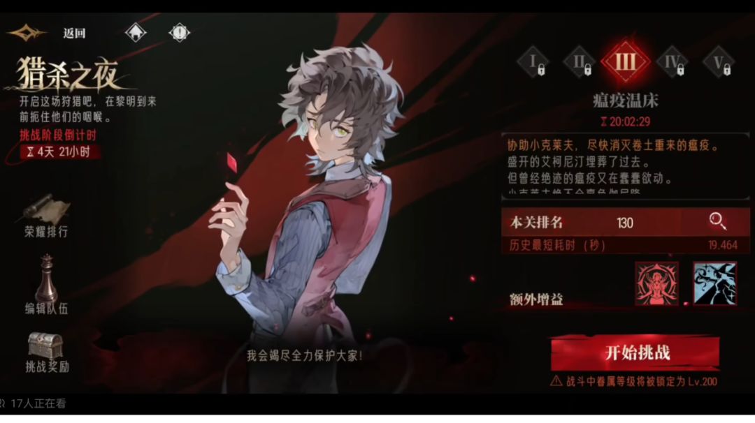 哈喽,大家好,今天给大家做这个第三天的猎杀之夜攻略! 排行榜上面的阵容有的人带这个带刺客,这些是因为他们苍凛的伤害都溢出了。 平民玩家推荐带这套阵容:苍凛,贝拉,齐格鲁娜,达尔卡罗,阿卡贝拉。 这套阵容的优势就是开局在带的5点血崩的情况下,可以完整的开出1套技能,而且伤害是没有一点儿溢出。也可以把这个达尔卡罗换成范海辛。 目前平民只推荐这两个内容。平民我不推荐带刺客,更不推荐把这个阿卡贝拉换掉,如