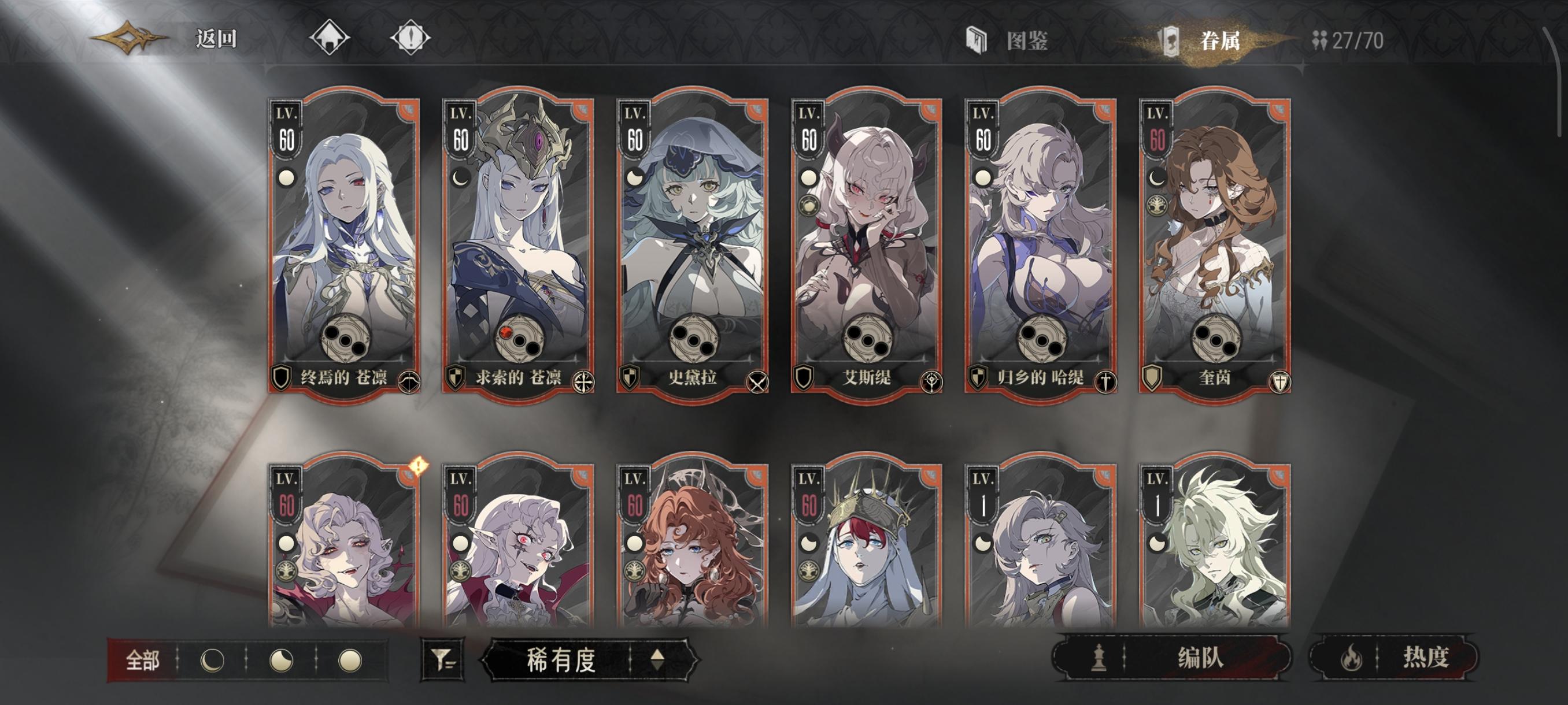 队伍现在有 1国家队(目前).终焉的苍凛(半周年可以领到),往日的贝拉(半周年会返场),阿卡贝拉,贝拉,奎因 2.暴击队.提丰,水贝(往日贝拉简称),阿卡贝拉,赛莉,莱夏(没有水贝可以换赛特,然后莱夏可以换奎因,提丰和赛莉是核心半周年进常驻) 3.姐妹队(黑夜队).艾斯提,莉薇娅,阿莱尼,水贝(没有换阿尔伯特),阿卡贝拉 4.法缪队,法缪,阿加莎,奎因(没有换大艾米),阿卡贝拉,阿尔伯特
