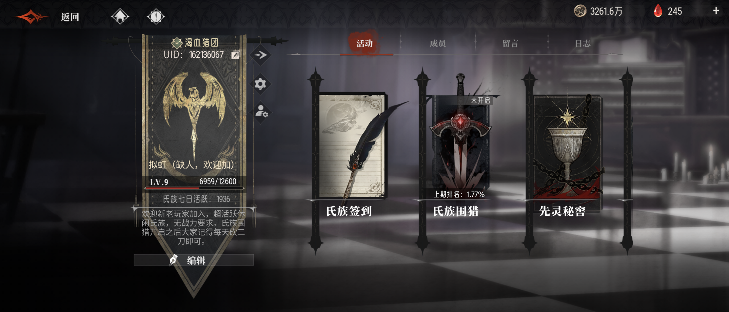 超活跃休闲氏族招人,没有qq群无需多余社交,适合社恐,等开围猎了每天打满三次就可以。无需审批自动加入,没有战力要求,活跃长期一起玩就可以。氏族ID:162136067