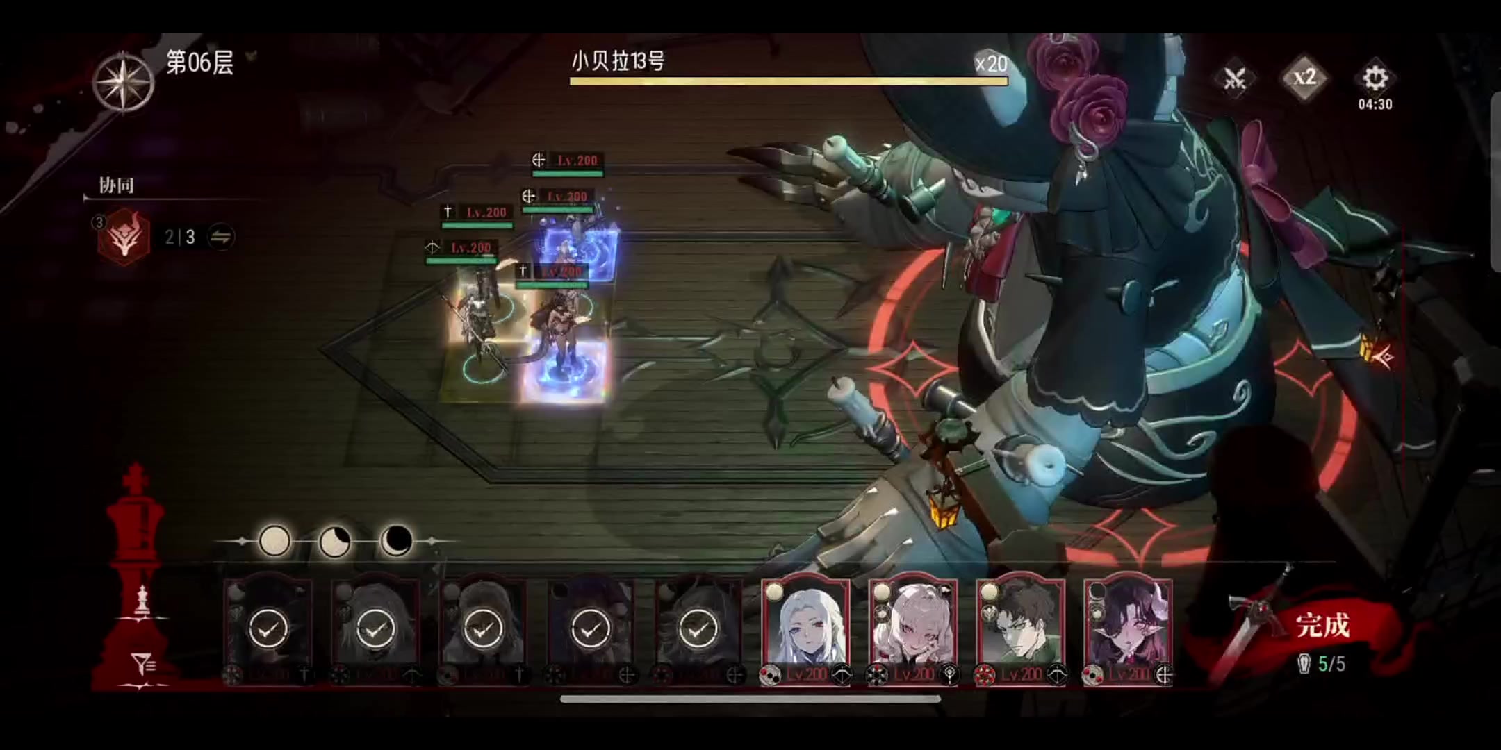 硬件:黑夜队全零命加一高命奶盾; 装备技能:全员全技能4级,装备全红即可,扛不住给衣服升级加血量; 未来遗产:三个残月给4级永生之果,达尔卡罗给海神之颅,白毛姐姐随便带一个把战力提一提即可; 凹法:奶盾负责开局承伤,只要黑毛妹妹开大前黑夜队全活着就行,奥义顺序:黑毛→白毛→达尔卡罗 三个人循环,白毛尽量等潜血满了再开大,伤害会高一些。 这么打能越战35%,但18-9没凹过去,应该是战力差太多,拼尽