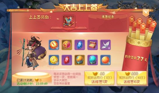 亲爱的仙友们:周末即将开启,精彩活动,不容错过,一睹为快吧!活动区服:开服大于4天的服务器活动一:【大吉上上签】时间:8月24日00:00-8月24日23:59活动内容:求得上上签,极品坐骑等你拿!大奖:百变坐骑宝盒(幽冥灵驹,翠竹使,雪绒绒)其他奖品:武器强化石*12 防具强化石*12 高级坐骑丹 4级攻击宝石 4级防御宝石中级坐骑精魄 紫色异火精华礼包 低级坐骑精魄 纸鹤*6法