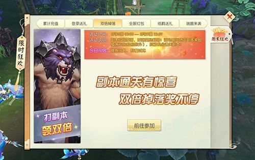 亲爱的仙友,新一轮福利活动来袭,心动不如行动!活动一:【欢乐祈愿】时间:7月20日00:00-7月21日23:59活动内容:祈福送礼,灭世之石、补地石碎片、补天石碎片等豪礼等你来拿!感受到大家之前的热情,本次活动延时一天哦~活动二:【登录送礼】时间:7月20日00:00-7月22日23:59活动内容:每日登录送好礼,只要登录就可领取奖励哟!活动三:【双倍掉落】时间:7月20日00: