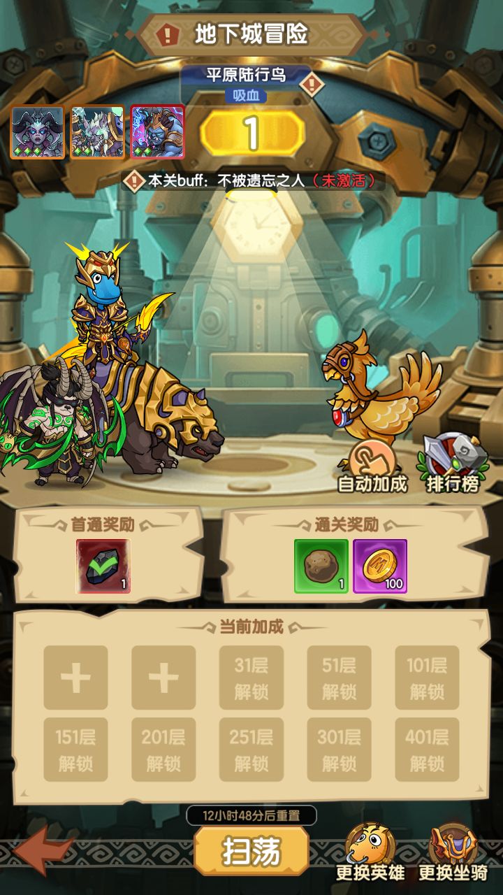 地下城冒险规则:一、关卡1.每层关卡首次挑战成功后,获得该层的首次通关奖励和挑战成功奖励,后续再次挑战仅可获得挑战成功奖励。2.挑战成功后可进入下一层继续挑战。二、加成1.通关特定关卡将会获得地下城加成BUFF,加成可为后面挑战带来助力。2.重复获得同样的加成,可以提升加成效果,但无法超过上限。3.加成仅在地下城冒险中生效。三、重置1.每天凌晨5点地下城将会进行进度重置,挑战进度