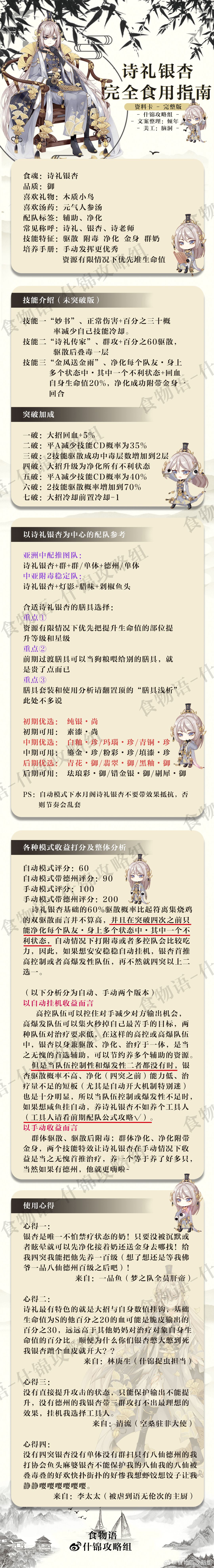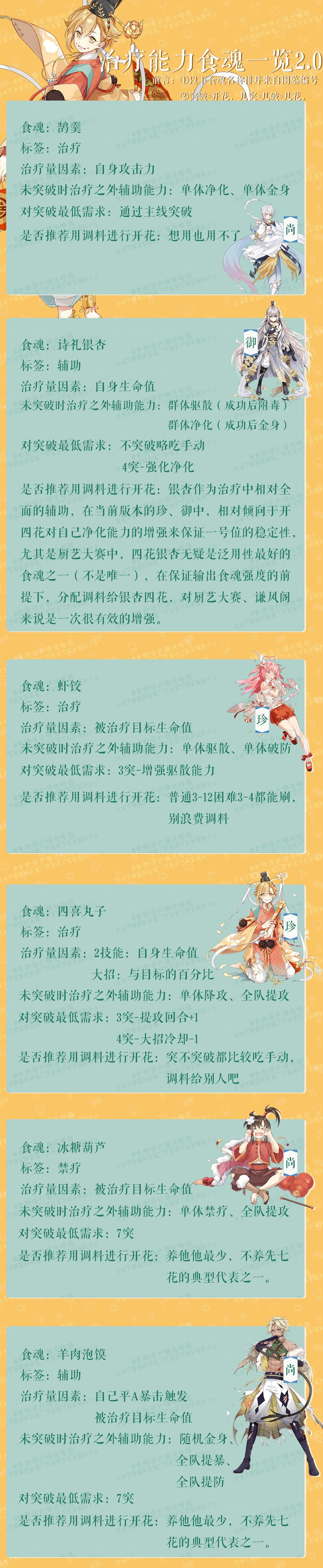 治疗按图鉴标签顺序排列 请牢记适合自己队伍的治疗才是最好的 2.0版,增加对两张御卡治疗的开花介绍。 诗礼银杏作为相对全能的辅助治疗,虽然没有提攻等能力导致他在无压力速推图中出场率不高,但是作为在拥有治疗能力的辅助这方面而言,四花时的净化对自身而言(尤其是厨艺防守)是很重要的一个分水岭,在推荐调料使用时,只考虑到了提升输出食魂强度来增加战斗效率,却没有考虑到在治疗这个分类中银杏的独特性,是文案的失