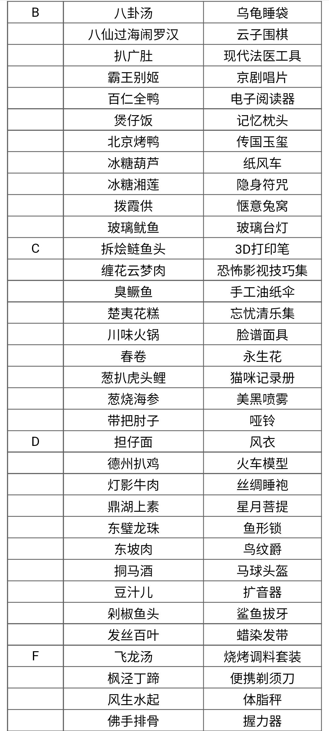 开水白菜:情人诗 太白鸭:夜光杯 绍兴醉鸡:解酒药 混汤酒酿元宵:汤圆抱枕 屠苏酒:消毒药皂 玉麟香腰:山海经 年年有余:绕口令全集 年糕:爆竹