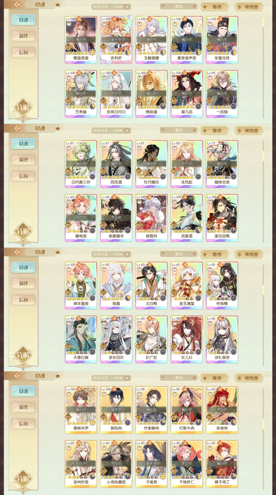 抄作业凹了一晚上终于卡在了31波死[表情_捂脸哭] 膳具没有一套御没有一个满级。甚至扬州炒饭用的散件因为真的没有成套可以用了。 食魂开花方面,御最高是腰子四花,其他御非0即1。 自证在最后一张[表情_举手]