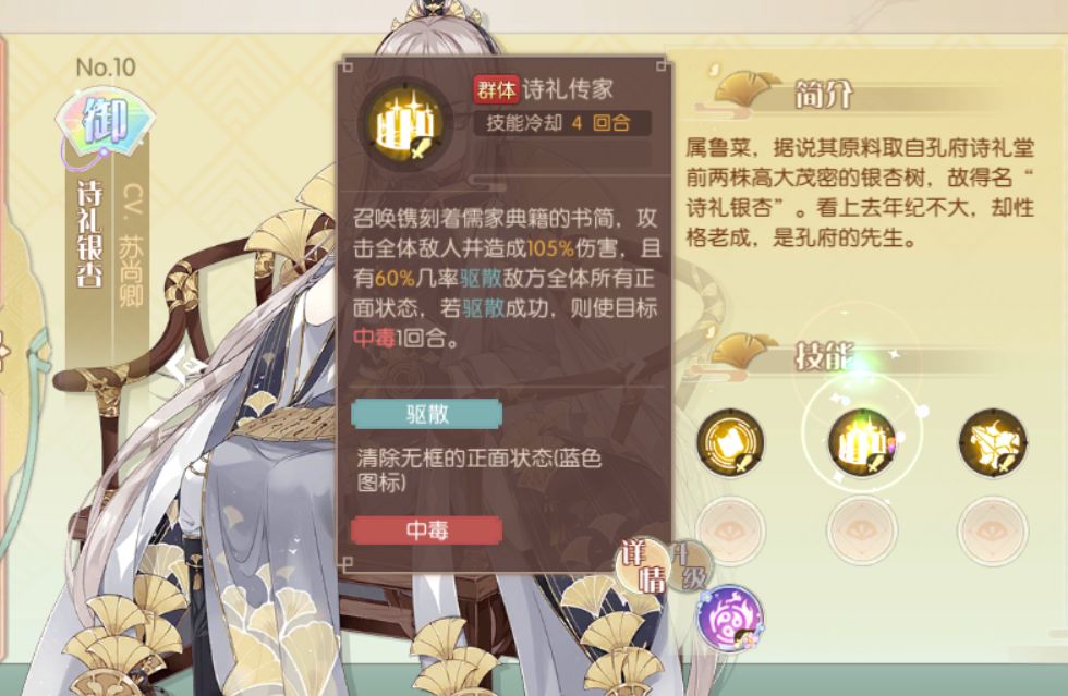 群体驱散 1.诗礼银杏 二技能群体驱散 2.风生水起 大招带群体驱散,每回合结束驱散敌方每人一个. 3.浪花东星斑 二技能概率全体驱散一个. 4.葱扒虎头鲤(没抽到希望有缘人给个彩色版的) 二技能群体驱散 5.符离集烧鸡 大招群体驱散 6.云托八鲜 二技能概率群体驱散 7.小鸡炖蘑菇 大招驱散 单体驱散 1.三鲜脱骨鱼 状态叫偷取.一般和驱散用法一样.满花偷所有buff 2.女儿红 二技能驱散一个
