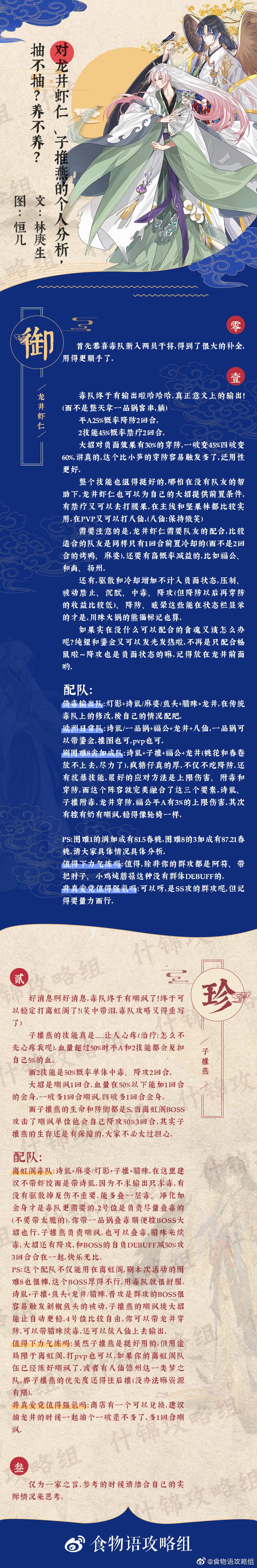 总贴:https://www.taptap.com/topic/10758621 治疗,就是拉血线,延长战斗能力,在初期是非常重要的一个环节,后期膳具提上来之后治疗的作用大大减弱,但是对于新手来说,这些都是后话 T0: 吉利虾:目前奶量最多的治疗,四花之后技能衔接就非常流畅,后期厨艺让你领略绝望的感觉,可以带玛瑙,填漆,散件无脑堆血量也可以,吉利虾一个人的奶量足够撑起一片天,如果抽中了吉利虾开局,