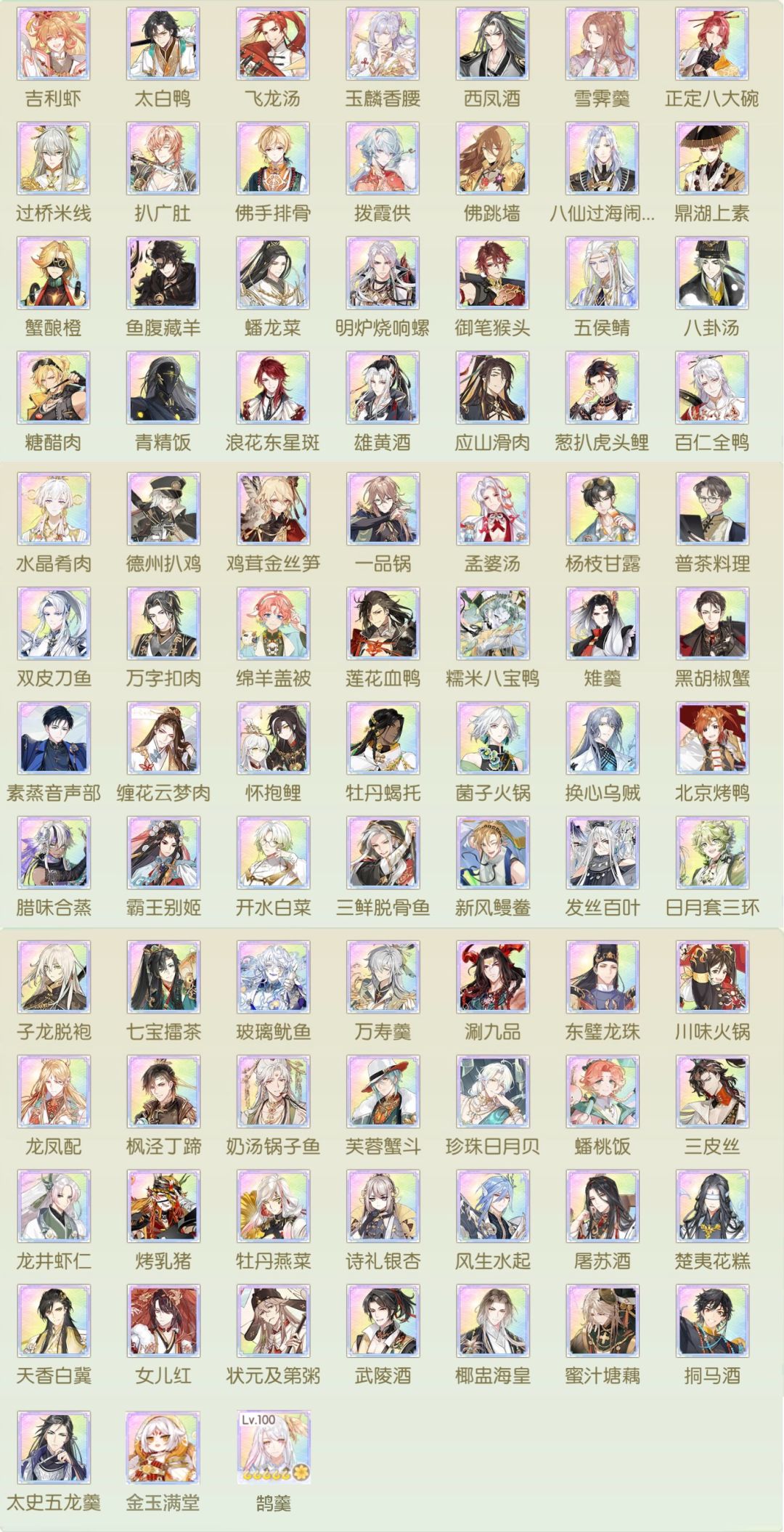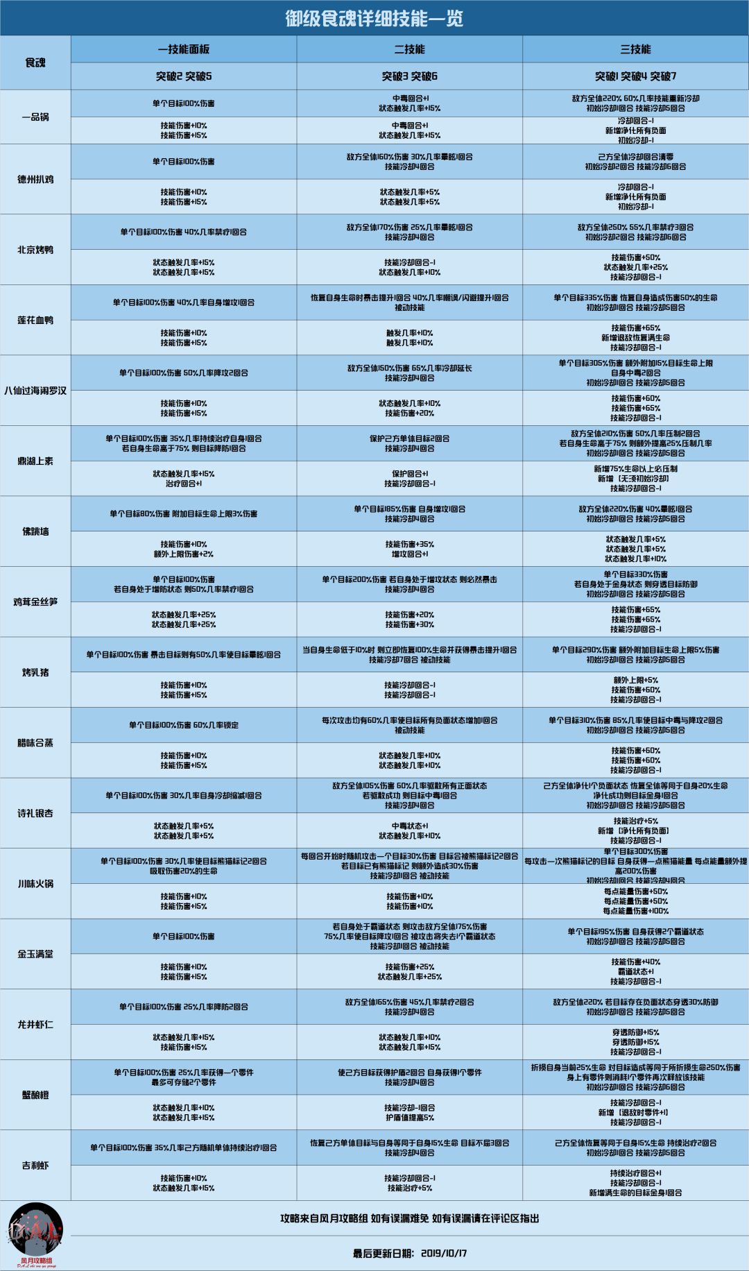 群体加盾 1.玉麟香腰 防御形态大招 2.正定八大碗 3.蟠桃饭 大招 4.饺子 需要必须血量掉到50%以下 单体加盾 1.小鸡炖蘑菇 被动 2.煲仔饭