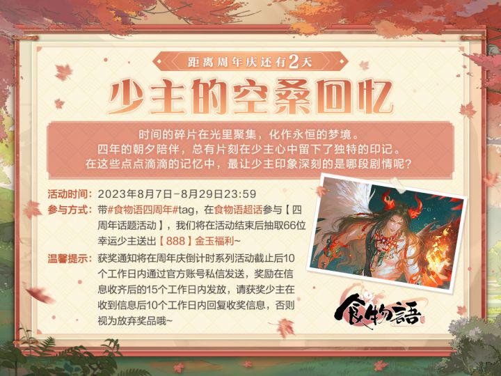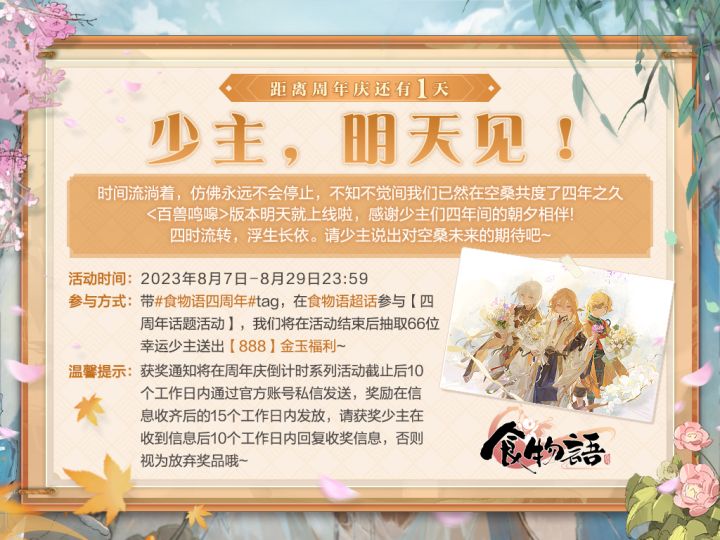 #食物语四周年#庆典即将于8月10日正式开启~现为少主奉上周年庆资讯前瞻第二弹!四时流转,浮生长依。四周年纪庆典#空桑同人庆典#共创接力活动预计在8月5日中午12:00开始,于微博、B站《食物语》手游官方账号或相关话题页开启 。届时还将发布版本pv、周年主题曲、开展丰富抽奖活动,欢迎各位少主前来观看打卡(。・∀・)ノ