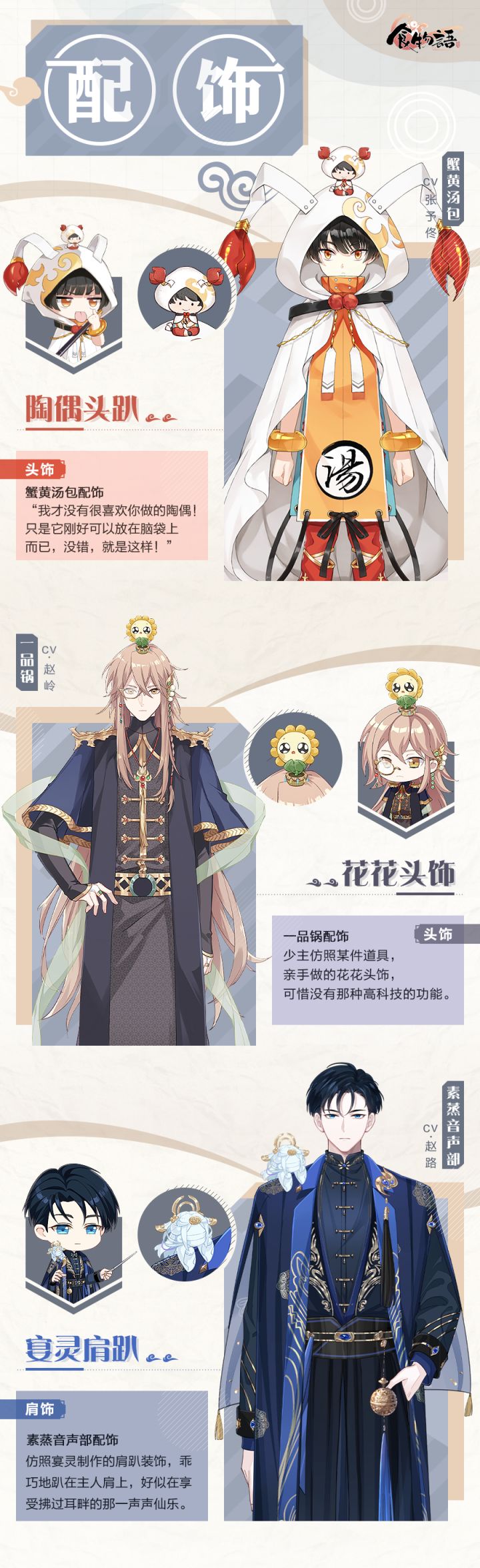 刀尺裁锦绣,针巧制华裳。蟹黄汤包「陶偶头趴」、一品锅「花花头饰」、素蒸音声部「宴灵肩趴」新品配饰登场! 现为少主奉上本期配饰一览。 ☆温馨提示☆每日活跃度达到指定要求即可获得对应数量的「工具包」,收集工具包可提升制作进度;制作进度等级达到指定要求可获得蟹黄汤包专属配饰「陶偶头趴」「膳具碎片·珍」等好礼!28元解锁【特殊奖励】,制作进度等级达到指定要求还可额外领取一品锅专属配饰「花花头饰」「