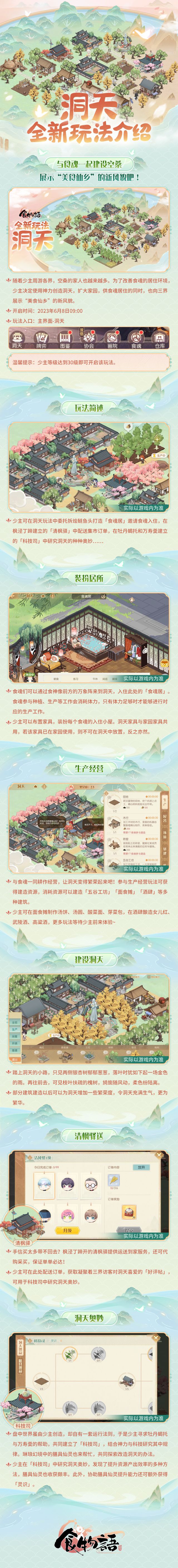 与食魂一起建设空桑,展示“美食仙乡”的新风貌吧!随着少主周游各界,空桑的家人也越来越多。为了改善食魂的居住环境,少主决定使用神力创造洞天,扩大家园,供食魂居住的同时,也向三界展示“美食仙乡”的新风貌~☆开启时间☆:2023年6月8日09:00☆玩法入口☆:主界面-洞天玩法详情请查看长图↓