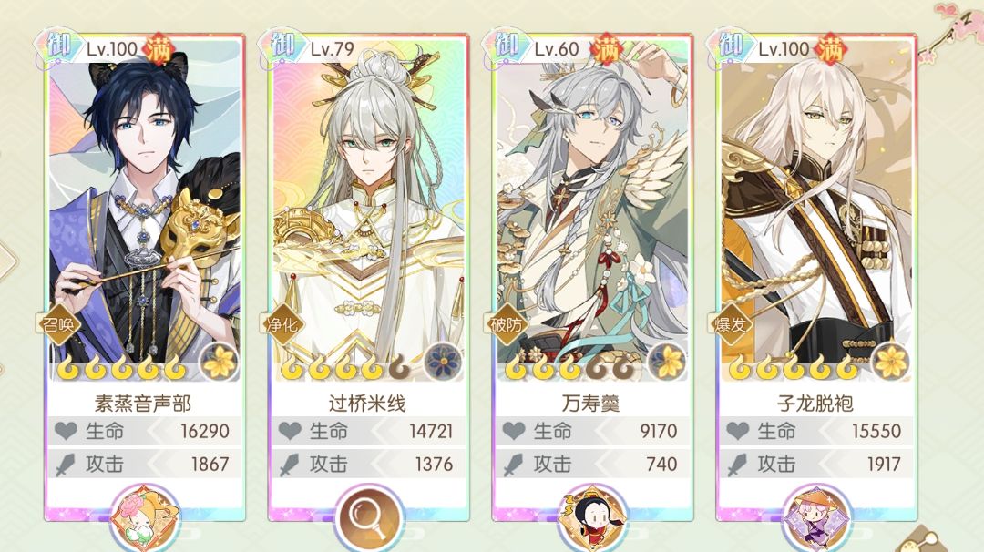 名伶17-20w:国主+米线+万寿羹+子龙 伤害不算高,但是练度易得。 国主万寿子龙泛用性都高,哪哪都能用,属于开花高保值系列。 希望能提供一些参考。 米线穿琉璃和命中都行,伤害差别不大。 运气好在20w,运气差紫泥一次都没爆过在17w,差不多点爆了两个大的在19w 。#攻略