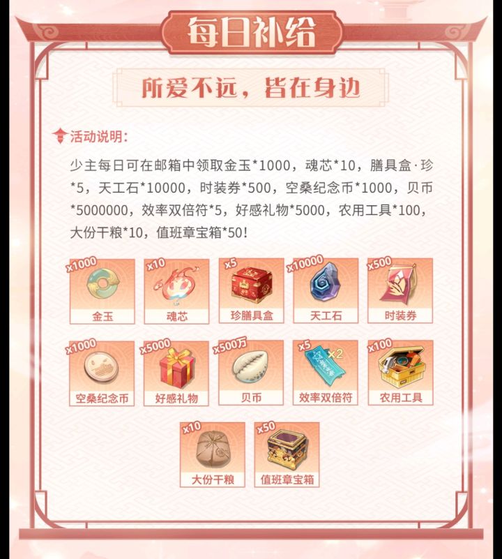 公告中提到的一部分时装,不知道别的还有什么。说起来,金玉也没必要太省,每日福利会送1000金玉,想买时装想买主界面背景的可以早买早享受。膳具也可以佛系一点,每日福利里的珍膳品盒有概率开御,像我一样的懒人有福了。PS:据说邮箱满了会卡掉每日福利的邮件,刷膳具的肝佬们注意一下#食物语