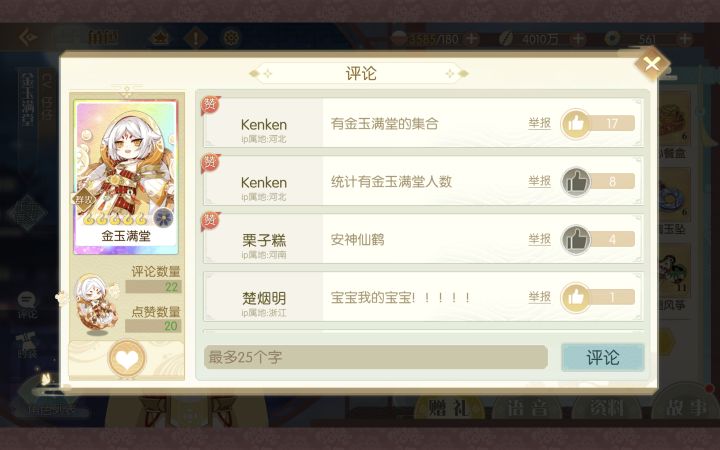 开服第一件事——升级之后去肝满堂宝贝!!!刷的坚果七层,扫荡能出,一次给20-23碎片,刷出五次大概花了3k体力的样子强不强都是一时的,可爱宝贝是一辈子的天使!!!开服玩家,二测刷宝贝刷到凌晨两点出的,公测大概是开服一个月刷出来的金玉满堂(点赞大概前30的样子)希望陪伴版的满堂宝贝能一直开心下去#食物语