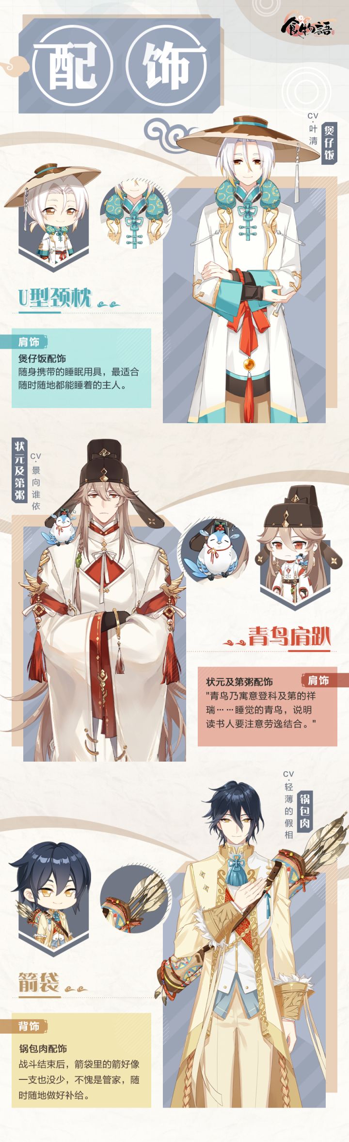 刀尺裁锦绣,针巧制华裳。煲仔饭「U型颈枕」、锅包肉「箭袋」、状元及第粥「青鸟肩趴」新品配饰登场! 现为少主奉上本期配饰一览。 ☆温馨提示☆每日活跃度达到指定要求即可获得对应数量的「工具包」,收集工具包可提升制作进度;制作进度等级达到指定要求可获得煲仔饭专属配饰「U型颈枕」「膳具碎片·珍」等好礼!28元解锁【特殊奖励】,制作进度等级达到指定要求还可额外领取锅包肉专属配饰「箭袋」「魂芯」「巧手