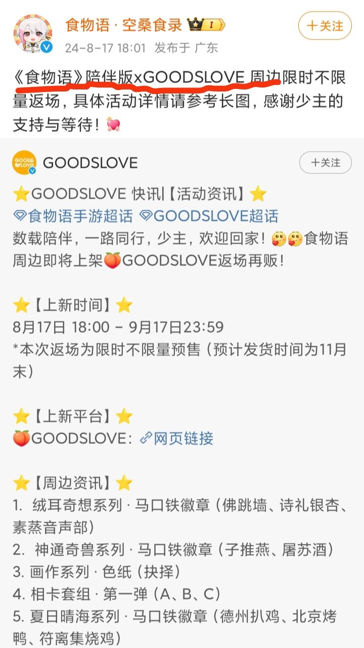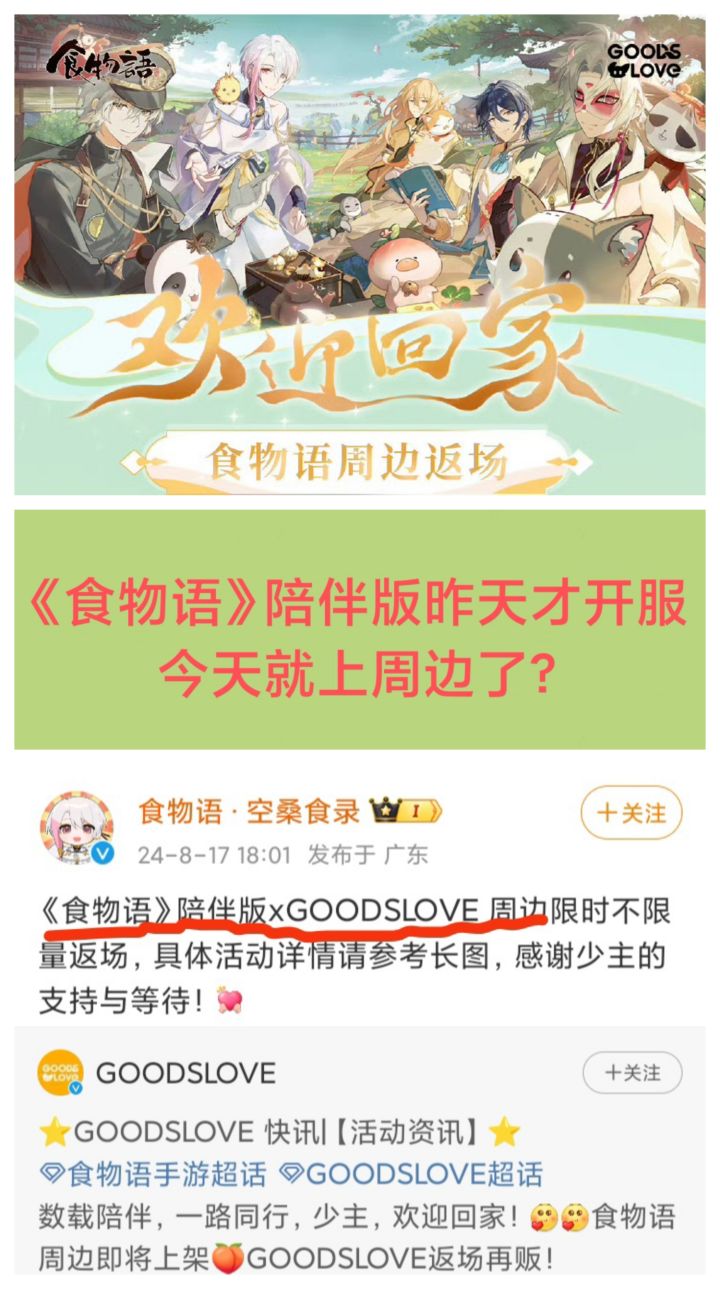 8/17号,才开服1天呀,《食物语》陪伴版xGOODSLOVE 周边就来了❓❓❓周边包含马口铁徽章,色纸,食魂契约书,镭射票,桌游等,价格10-55之间刚上线1天就卖周边,穷图匕见了么不知道大家怎么看?#今天游戏圈发生了啥 #游戏资讯 #食物语 #食物语陪伴版