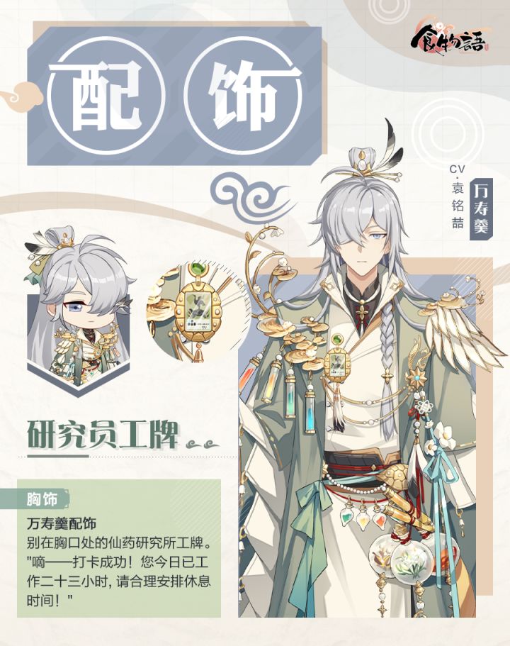 刀尺裁锦绣,针巧制华裳。万寿羹「研究员工牌」新品配饰登场! 现为少主奉上本期配饰一览。 ☆温馨提示☆活动期间,登录即可领取万寿羹专属配饰「研究员工牌」!