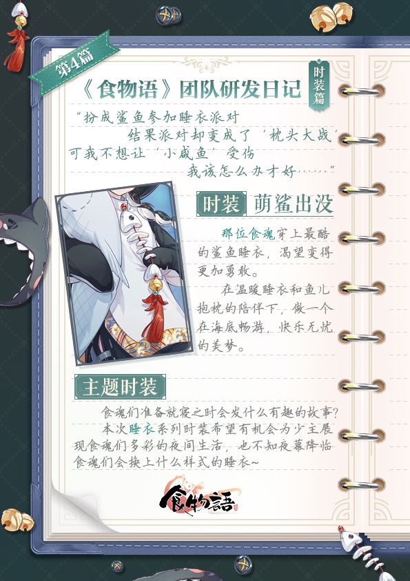 《食物语》团队研发日记·时装篇那位食魂穿上最酷的鲨鱼睡衣,渴望变得更加勇敢。在温暖睡衣和鱼儿抱枕的陪伴下,做一个在海底畅游,快乐无忧的美梦。