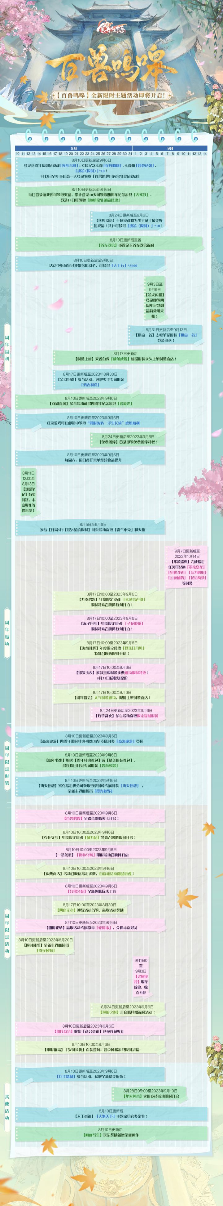 全新限时主题活动#百兽鸣嗥#将于明日开启!现为少主奉上活动日历。 更多详细信息请以游戏内版本为主。 更多后续更新公告、活动内容及最新消息请关注《食物语》游戏内公告、官网~