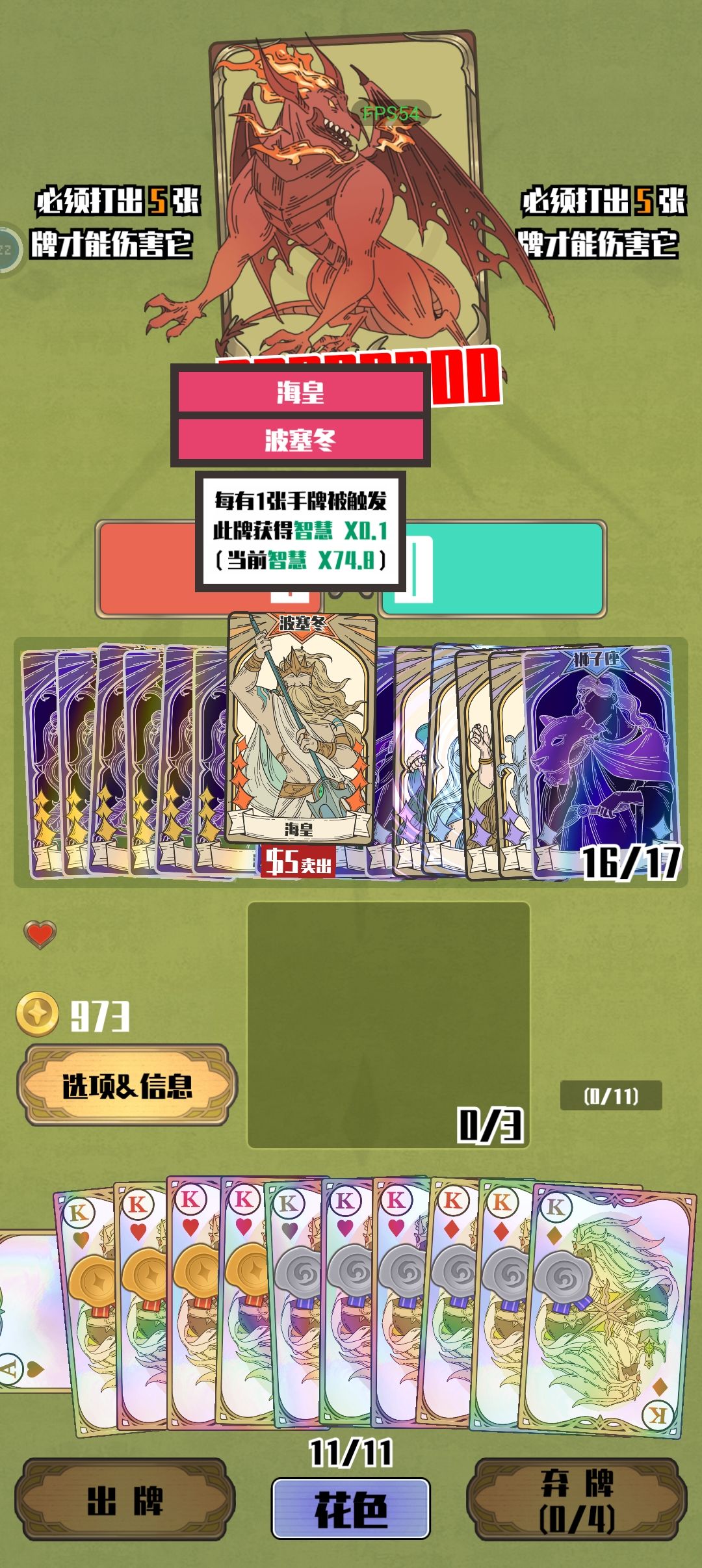 书接上回史诗天神最后要讲的一位(史诗天神当然不止这些) 5. 和谐女神,同花和顺子可以由4张牌组成,这个在牌库花色没有较集中前能降低做高级牌型难。 (3)传说天神 1. 珀耳修斯,消除怪兽技能。感觉是前期就很好拿到的传说天神,也蛮好用,主要对付那些两条命的、手牌翻面之类的技能。还行吧。后期我不用,基本随便秒怪物。 2. 丰收女神,你在本局游戏中每使用一“种”成长牌,击败敌人后就拿多少金币。成长牌一