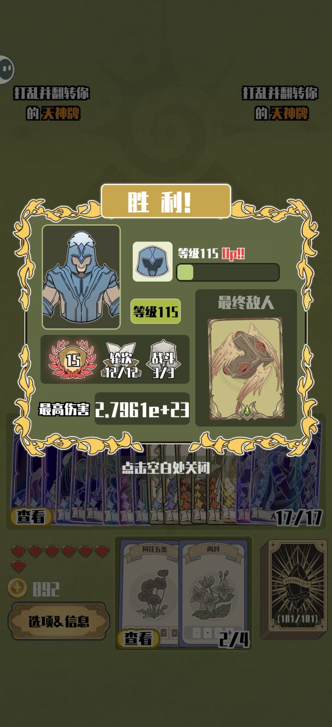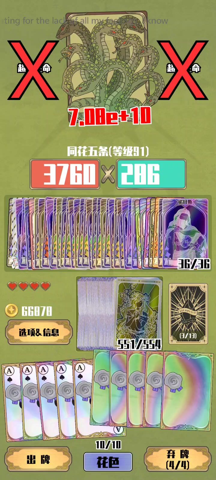 通关配置:大地之母-盖亚*1+冥后-珀耳塞福涅*n+天象之神-克利俄斯*n+山岳女神-回声*n(+大洋仙女-墨提斯*n) (*注:由于冥后单次获得的牌设了上限,所以本体系上限收到了大副削弱,但不影响通关,四五十张咒术牌依旧能靠天象单通) 简述这套卡组的运行机理就是:通过堆叠冥后给的隐匿咒术牌,使天象能够多次触发智慧*2效果 详细的说就是:冥后在按顺序触发不同花色的牌后会给一张隐匿咒术牌(触发包括手