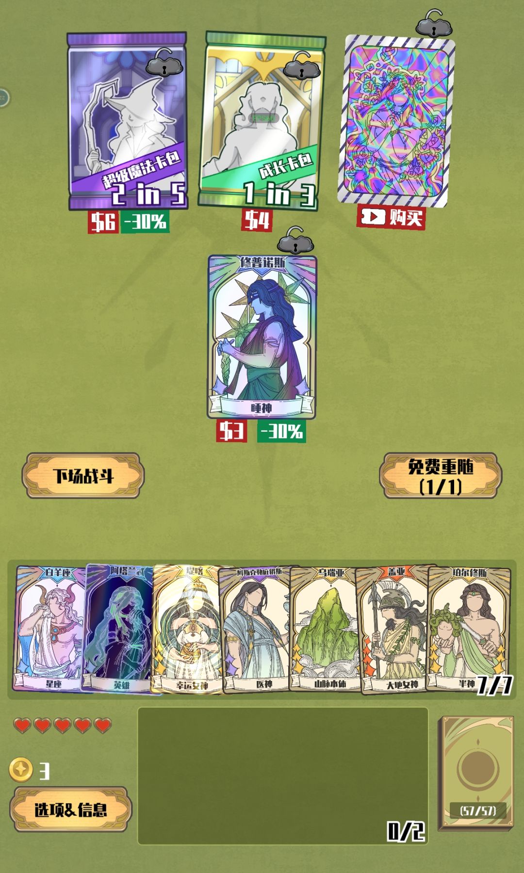 书接上回史诗天神最后要讲的一位(史诗天神当然不止这些) 5. 和谐女神,同花和顺子可以由4张牌组成,这个在牌库花色没有较集中前能降低做高级牌型难。 (3)传说天神 1. 珀耳修斯,消除怪兽技能。感觉是前期就很好拿到的传说天神,也蛮好用,主要对付那些两条命的、手牌翻面之类的技能。还行吧。后期我不用,基本随便秒怪物。 2. 丰收女神,你在本局游戏中每使用一“种”成长牌,击败敌人后就拿多少金币。成长牌一