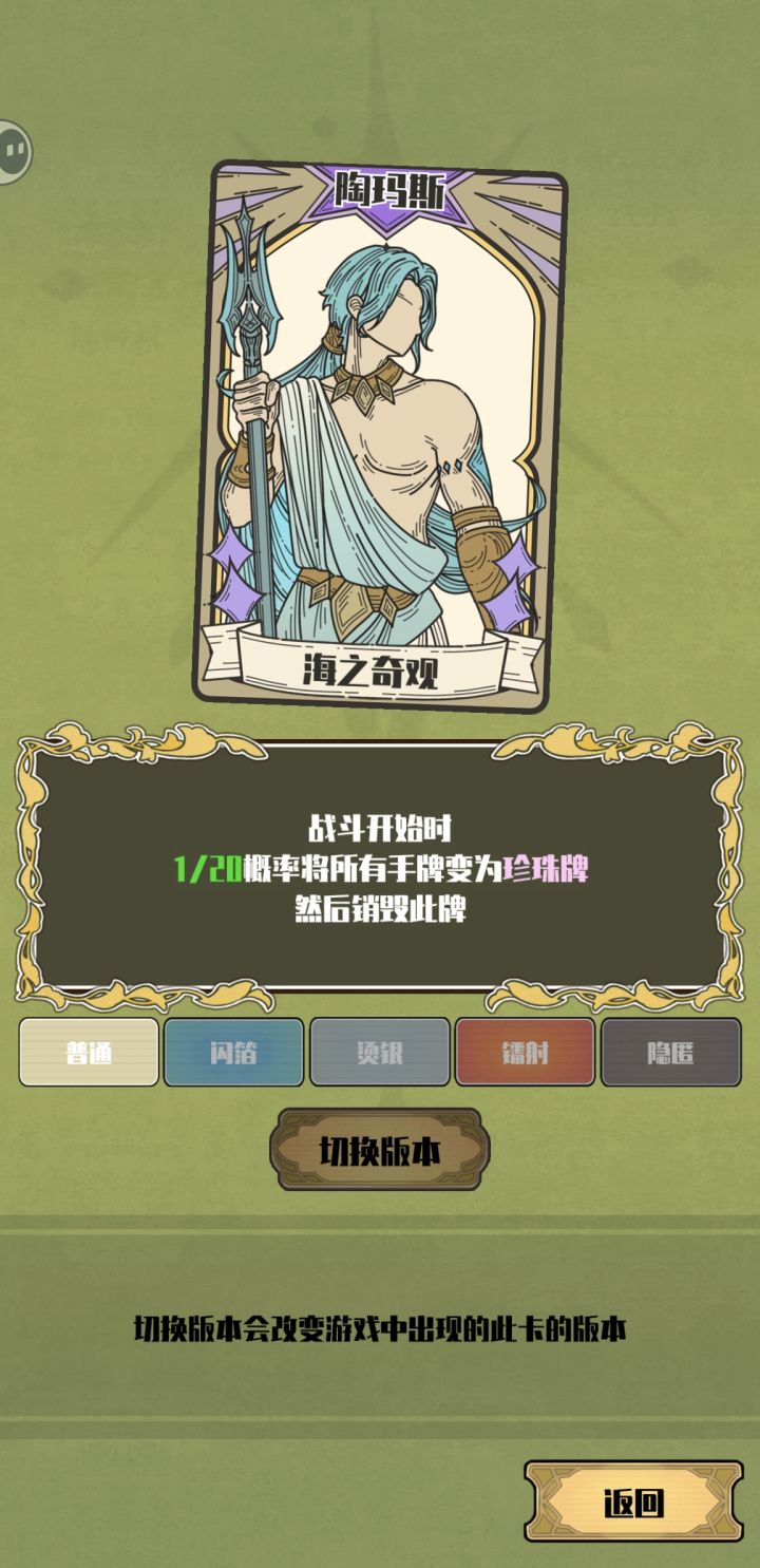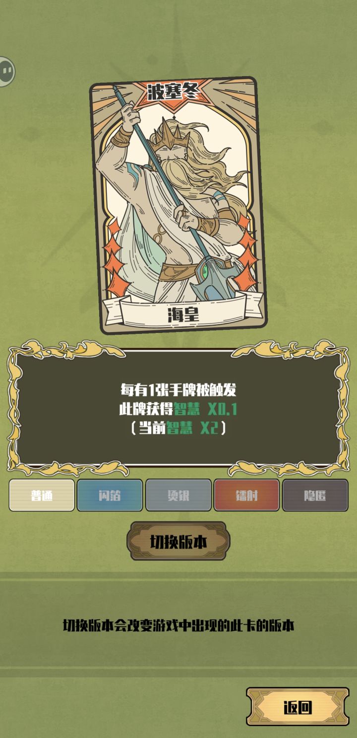 (以下内容来自体感,可能有不准确的地方,欢迎指正)突然发现波塞冬的养成,并不是以打出手牌的触发来算,而是以留在手里的牌,最终结算时触发来算,简单的说也就是珍珠/金箔/蓝印,那么养成时就要尽量最后在手中留下尽可能多这三类的牌,这是大前提亲亲海后,双重触发,养成速度直接翻倍(配合回声食用更佳)金箔和蓝印的获得都不太稳定,而且后期金钱大富裕,所以珍珠牌是首选,海之奇观可以一次给整条珍珠牌,触发一次