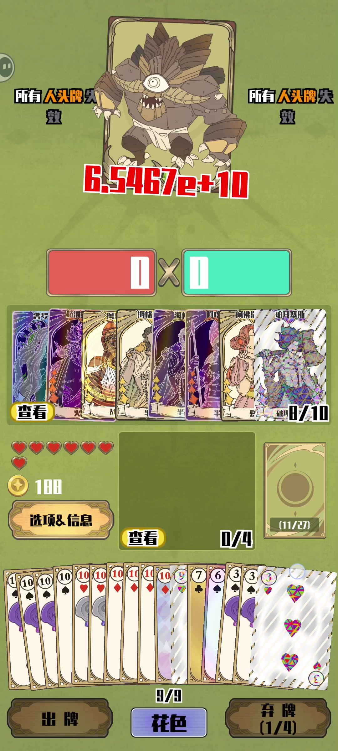 天神牌,消耗牌,手牌,金钱,弃牌次数全部只增不减。最多的时候刷到5000多块钱。伤害还能继续刷,实在是不想刷了。输出全靠宙斯和哈迪斯,赫尔墨斯钱袋子,俄尼里伊加弃牌,卡俄斯最强辅助。想要成型必须要有4张以上隐匿卡俄斯。游戏开始前可以用自选卡牌获得,卡俄斯越多越好,卡纳托斯可以精准复制,复制天神咒语牌概率低。赫尔墨斯加卡俄斯,商店花钱速度赶不上赚钱速度,买的越多赚的越多,刷新100次以上才能