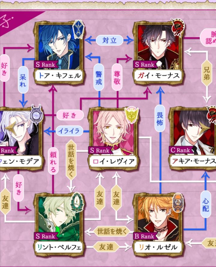 –––––––––––––––以下是人物关系以上是人物关系–––––––––––––––以下是可攻略人物(都是王子啊~)没记错的话目前只有这三个开放了接着放剩下的王子P.S.这只蓝毛我也喜欢,可是他和ガイ是对立正营,怎么办orz要不要吃一对相爱相杀呢(手动滑稽)以上是可攻略人物(王子)–––––––––––––––以下是王子们的随从和其他人员(不确定是否可攻略)以上是王子们的