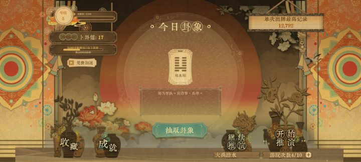 比如:增加游戏深度(主要是指周易卦象与爻词在游戏中的变化)从而增加基础可玩性,出一些历史角色(诸葛亮,李淳风,袁天罡之类的)有独特技能且不影响游戏平衡,添加一些小游戏(每日一卦,《周易》《梅花易数》的电子书,等等),UI优化更有中国风(左边乘法计算和手牌是扑克牌太有外国味儿了,可以改成算盘和算筹之类的)。
