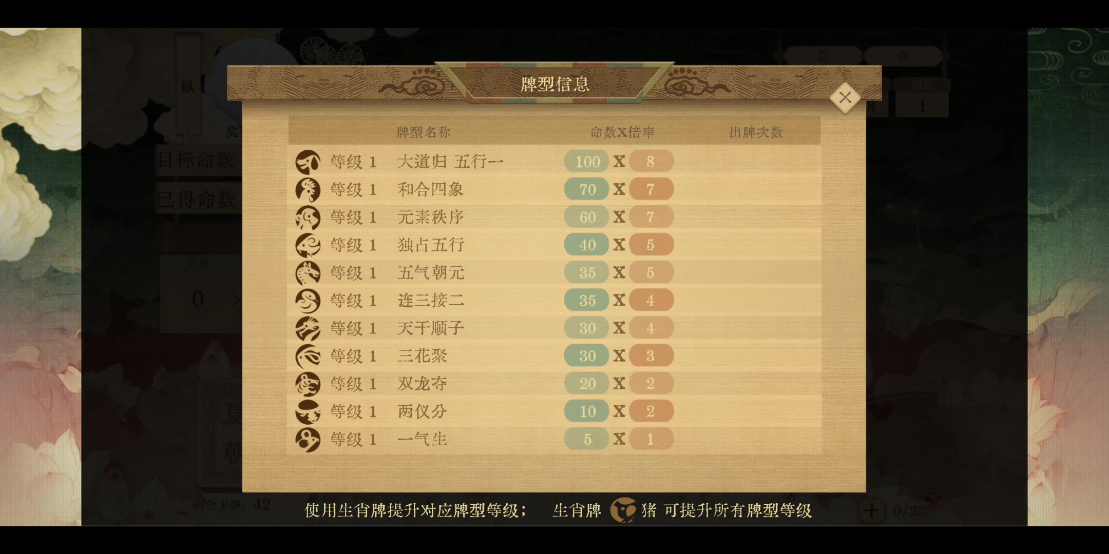 《周易·系辞·上传》曰:“大衍之数五十。 ”“大衍之数五十”自古以来有很多的猜测,古人吵得不可开交。在我们的游戏里,自创以十天干“甲乙丙丁戊己庚辛壬癸”来指代古代十种身份——“帝王将相、士农工商、医者兵卒”,每种身份有“金木水火土”五行之分。合大衍之数五十张“天干五行牌”作为玩家的手牌。而十种身份可与先天八卦位置一一对应,皇帝在乾位,乾卦代表天,象征创造、领导和决策,表示首领;官员在坤