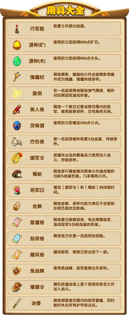 各位主公好呀!前面咱们跟大家介绍了兵种,有小伙伴问了,游戏里有没有什么道具可以来辅助战斗的呀?那当然有啦!在游戏中您可以从系统中获取战斗用具,还可以在江湖客(NPC)那兑换。不过这个江湖客呀,不爱财,爱喝酒!叫什么来着,哦对对对,仪狄酒!江湖客那里有不少用具,不过他还藏了好多,提升跟他的友情可以解锁更多用具!下面我们就来看看,游戏里有哪些用具吧!