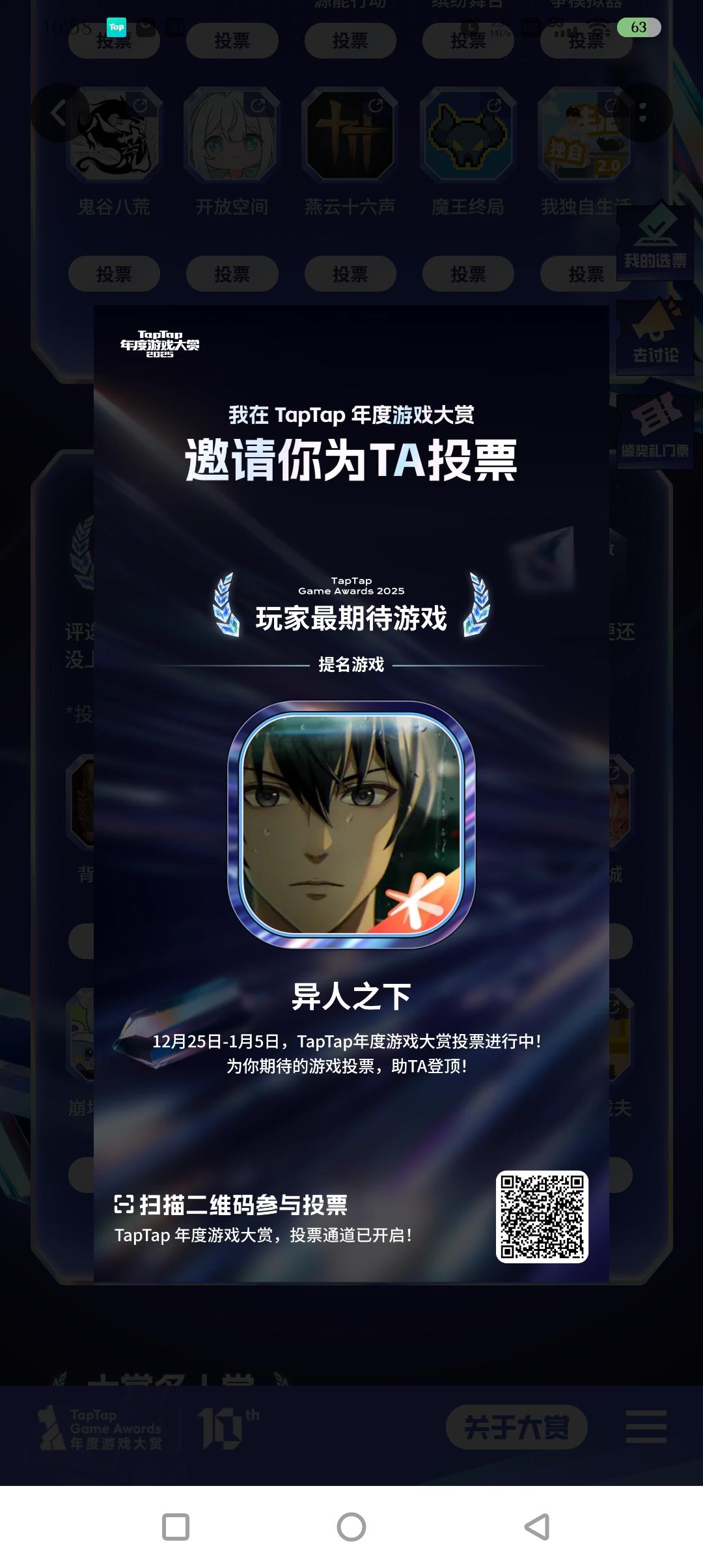 亲爱的玩家们:《异人之下》成功入围了 #2025TapTap年度游戏大赏 「玩家最期待游戏」奖项的评选,感谢TapTap平台以及大家一直以来对我们的关注和支持! 点击下方链接前往投票页,为我们投票加油,一起冲刺荣誉吧~也可以扫描下方图片二维码,直达活动现场~第一步:前往【玩家最期待游戏】分区,并选择异人之下进行投票;第二步,投票后点击为TA拉票,生成图片,可直接截图或右键保存,记得添加