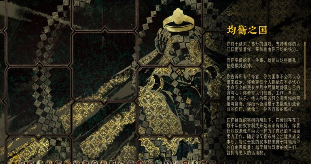 《苏丹的游戏》中有着许多结局,其中均衡之国这个结局应该怎么达成呢?下面为大家带来的《苏丹的游戏》均衡之国结局达成方法,希望能够帮助到大家。 我这把杀了女术士,走的是金妃线,建议不要游戏前期就走这条线,要的东西很多。 首先就是要一个3魅力的装备,30金币和一个珍奇;触发后续她会找你要苏丹的种子,你需要把她给的信物拖到俺寻思然后把谋逆/对苏丹的恐惧思潮(我给的已经是金的了,可能不一定要金的)放进去,之
