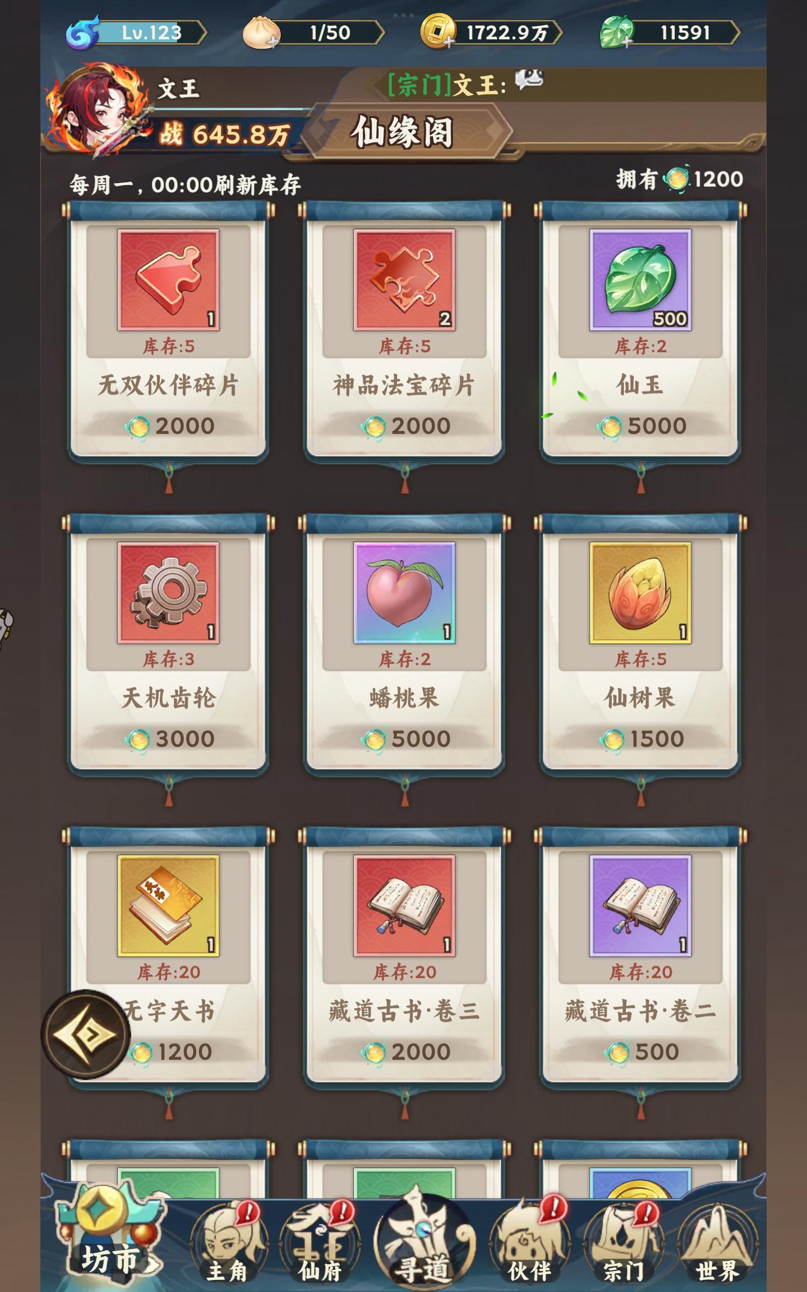 #游戏种草计划 开局仙玉不要乱用,只把每天体力买满,寻仙完成500抽即可获得2星弈秋+姜子牙,然后宗门任务开启,每天买满妖兽讨打,获得庄周,无双碎片升级2星,即可获得3无双。