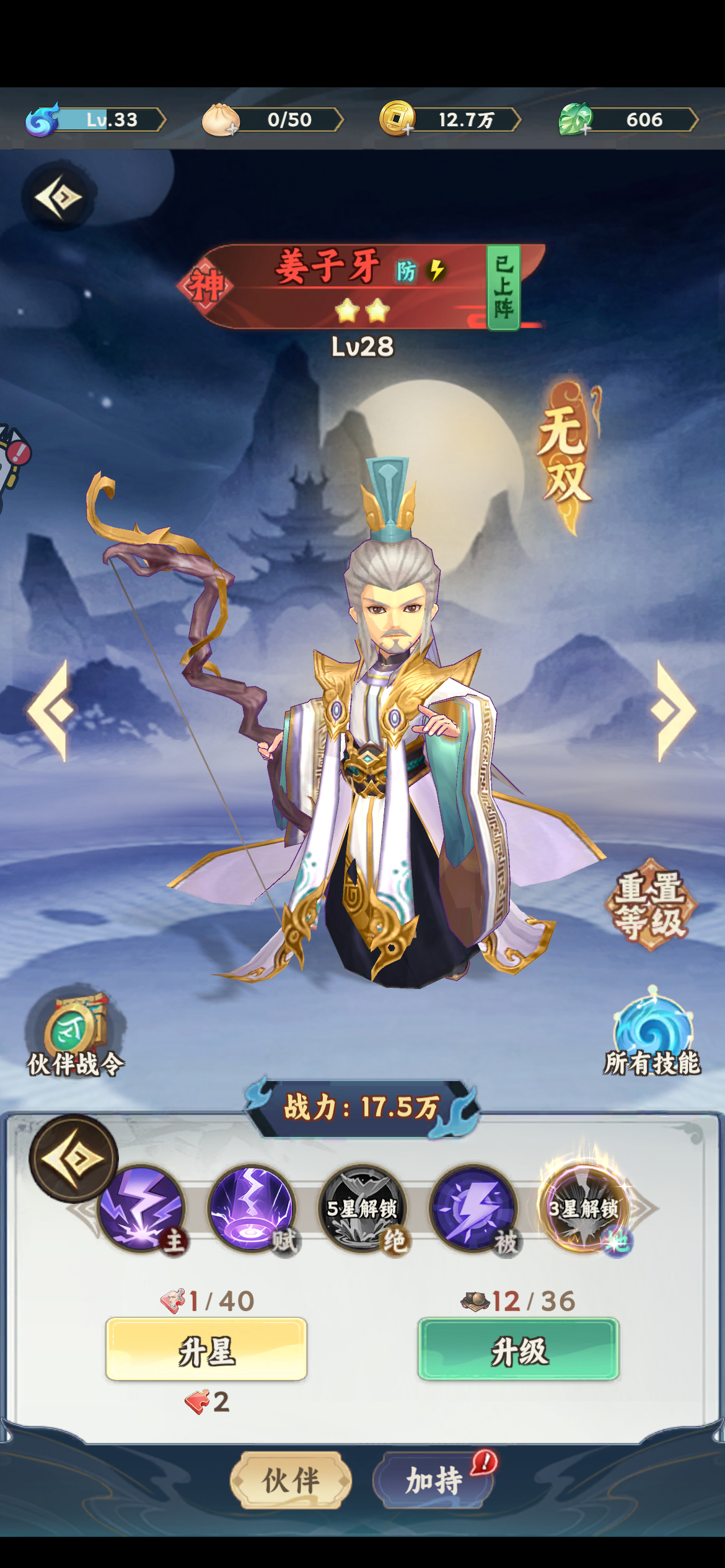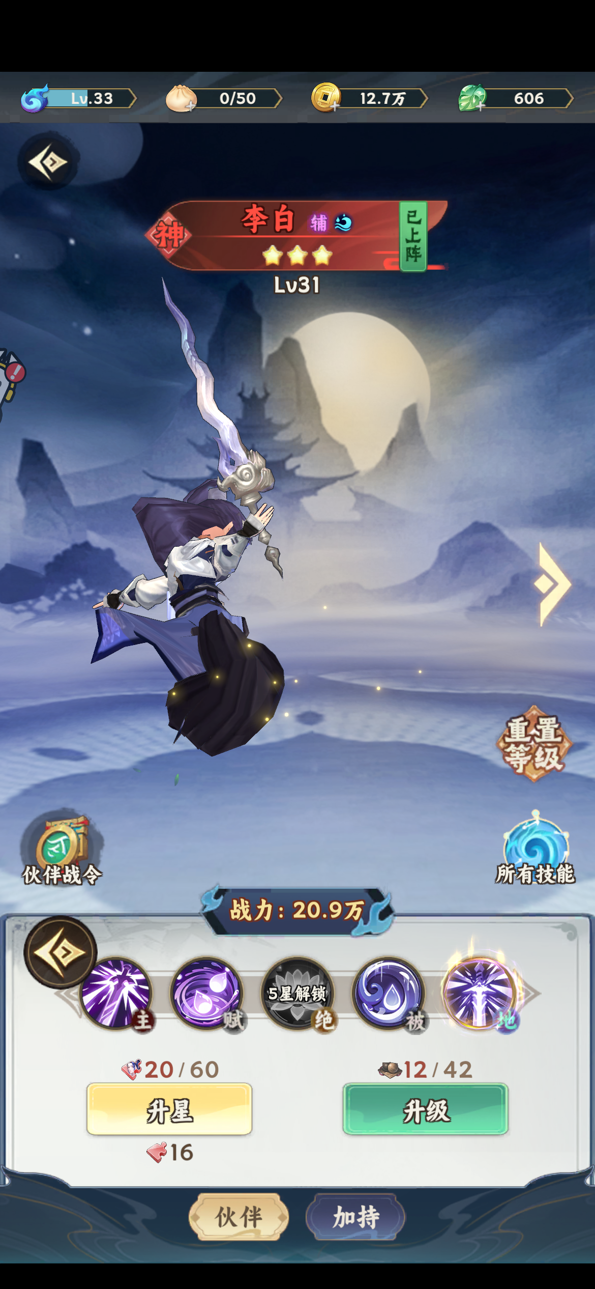 第二天核心养成+阵容过渡攻略 一、李白优先级拉满(四星→五星) 1. 升星资源聚焦第二天先把李白冲到四星,核心资源(升星碎片、突破材料)全砸给他:- 日常任务、寻仙保底的神品碎片优先兑换李白;- 伙伴战令、坊市兑换栏优先换李白升星道具,别分散给鲁班/青鸾。2. 等级与技能拉满李白等级跟主角走(29级拉满),技能优先点主/赋/地三个核心技能,5星解锁的“绝”技能等升五星