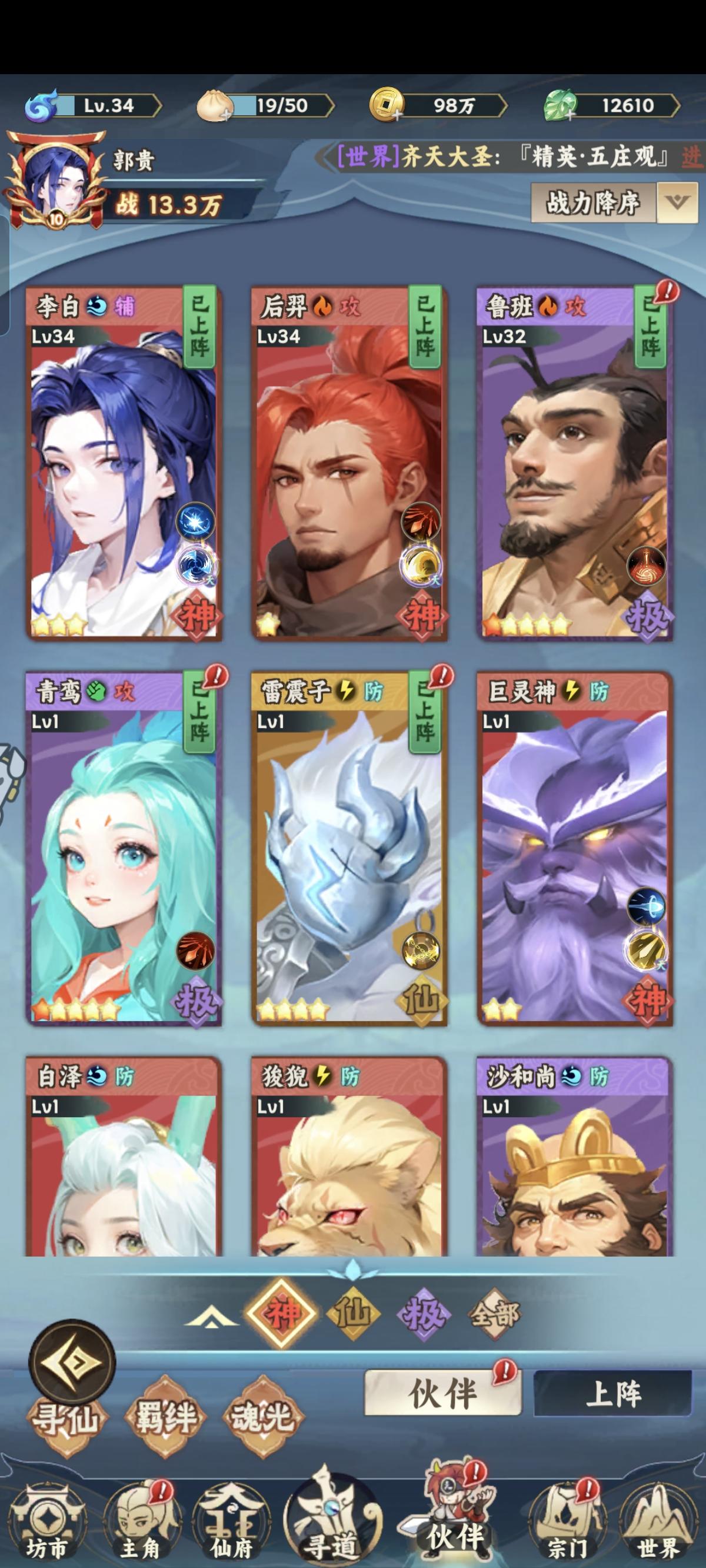 #游戏种草计划 开局仙玉不要乱用,只把每天体力买满,寻仙完成500抽即可获得2星弈秋+姜子牙,然后宗门任务开启,每天买满妖兽讨打,获得庄周,无双碎片升级2星,即可获得3无双。