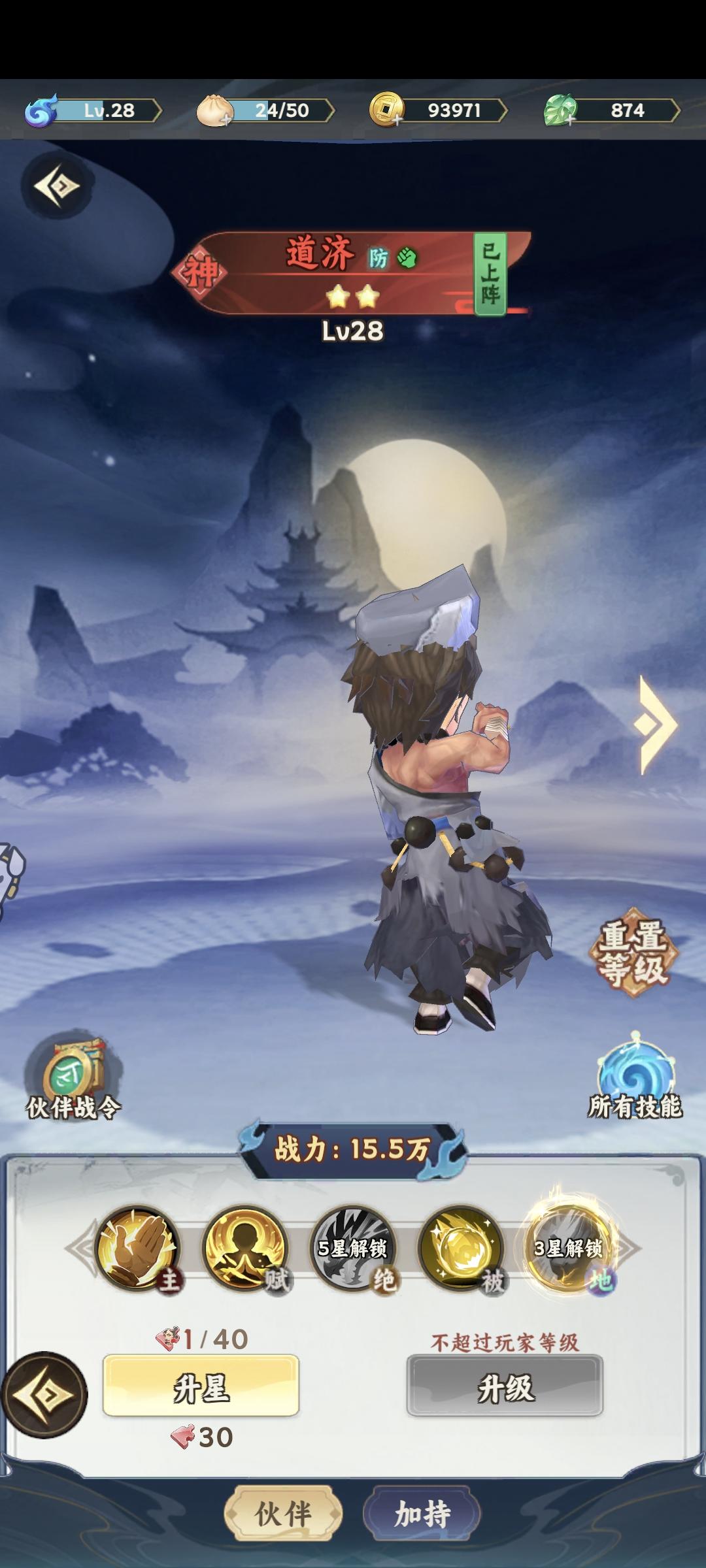 核心目标 围绕伏魔剑法体系,道济冲3星拉满养成,辅助伙伴只激活核心辅助技能,不额外投入资源。 1. 开局速推 - 只做必做主线,解锁宝典、伙伴养成、副本扫荡功能。- 道济上阵当核心,云中子、苏妲己仅上阵激活辅助技能,不升级/升星。 2. 资源全倾斜 - 体力:全刷铜钱/灵气副本→道济碎片副本,元宝只买2次体力。- 抽卡:券/元宝只抽道济UP池,目标凑3星(保底1-2