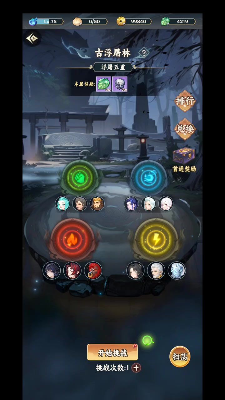 本人从160w战力开始打浮屠五重,失败多次,今天终于通过给大家发个攻略。 个人感觉浮屠林第五关通关前提是3个高等级天神 千机塔火龙塔等级到75级+,所有上阵伙伴等级40级以上,主力伙伴60级以上。 攻略: 整体难点及应对 1、全程无任何补给,小伤害积少成多就死在半路了。对策,用神农鼎全程缓慢回血,庄周拼脸掉鸡腿,催心鬼爪+无常剑杀怪回血。 2、boss都是组队出现,躲一个boss容易被另外的bos