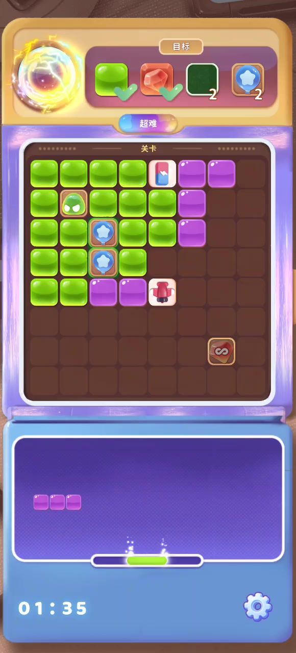 如图,两个史莱姆扩大到一定大小就会挡住气球,导致软锁,而且两个史莱姆会和信箱组成一直消除的一行。建议将气球的优先级调高