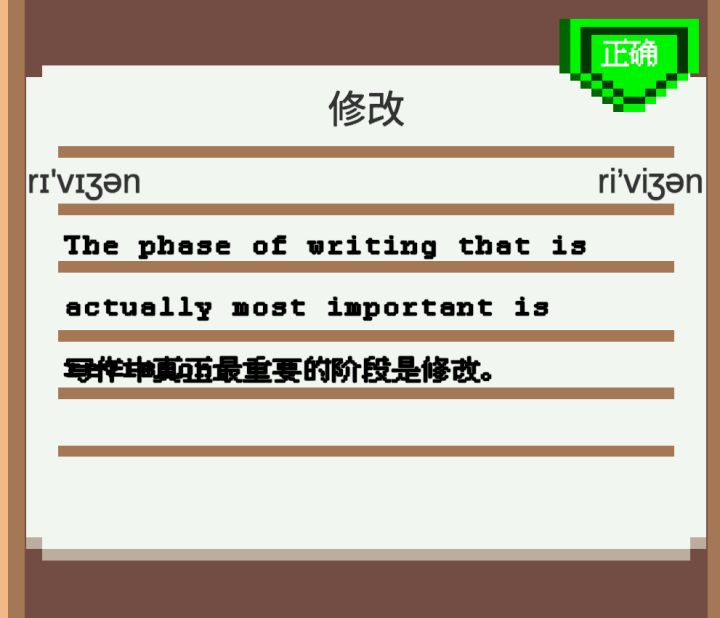例句超过三行时就会出现这bug。顺说虽然像素更贴游戏风格一点但我觉得,只是我个人觉得,还是用常规字体更容易识别一点,有时候经常是我大脑还没把字体切过来没意识到这个字母是什么,例句就没了……以记单词的工具软件来看还是统一字体比较好?不太确定到底是风格特色还是bug啊这个音标位置……哪怕是特色也稍微往中间靠靠吧,超出横线边界总觉得有点怪_(:з)∠)_