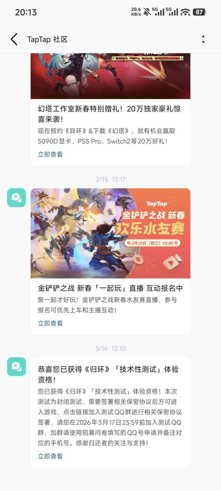 各位归还者,《归环》「技术性测试」测试资格正在陆续发放中,您可以通过以下方式查看是否获取本次测试资格。![[表情_开心]](https://img.tapimg.com/market/images/48516f625646b5ea2c66f0cab3c9c52a.png)