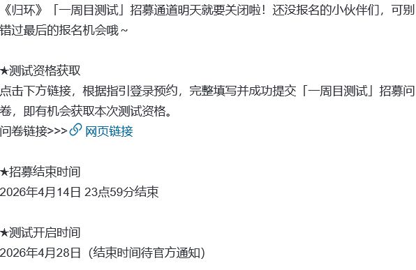 归环首次定档4.28! 测试招募结束通知