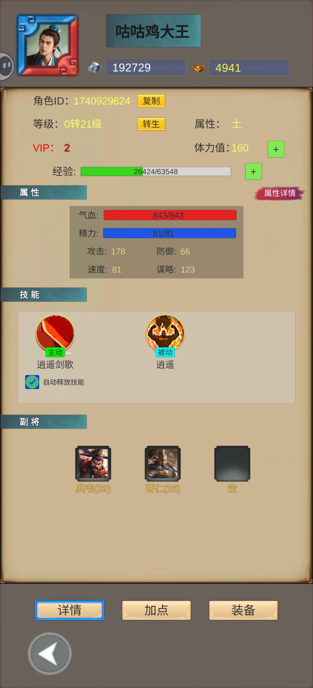 结合目前版本,开局属性主角选择速度>气血>攻击 开局选择好属性后就是选择物理输出技能和策略输出技能,物理输出技能很好用,策略输出技能偏后期 接下来就是武将心得,武将优先程度排名 T0:吕布,貂蝉,诸葛亮,周瑜 T1:马超,赵云,典韦,曹仁,甄姬,黄月英,甘林 T2:张辽,司马懿,关羽,张飞,黄盖,华佗,小乔,夏侯惇(没上榜的T3后就不列举了) 新人开局优先抽曹仁,上阵副将赵雪儿前期开荒小能手,再去